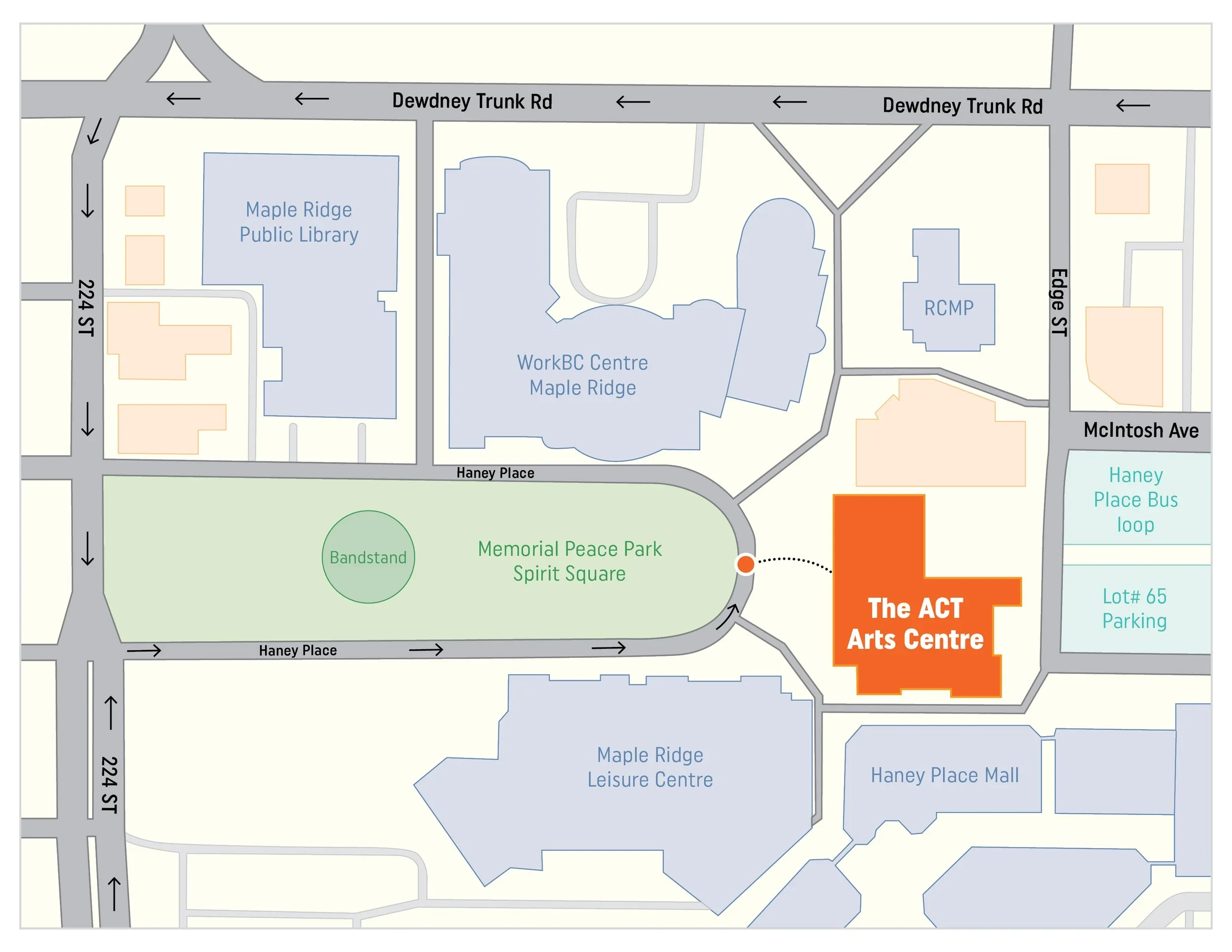 Public pay parking is located on-site at 11944 Haney Place, with access to The ACT Arts Centre. Follow the ACT signage, in the green section, to the elevator or stairs leading directly into the facility.